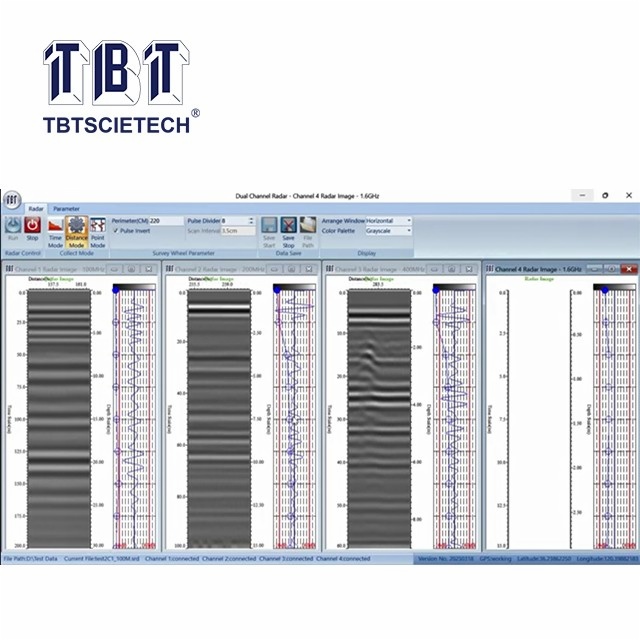 TBTGPR Series radar uses high-frequency electromagnetic (EM) waves (from low to high frequency) to acquire subsurface information. TBTGPR detects changes in EM properties (dielectric permittivity, conductivity, and magnetic permeability), that in a geologic setting, are a function of soil and rock material, water content, and bulk density. Data are normally acquired using antennas placed on the ground surface or in borehole or in air. The transmitting antenna radiates EM waves that propagate in the subsurface and reflect from boundaries at which there are EM property contrasts. The receiving GPR antenna records the reflected waves over a selectable time range. The depths to the reflecting interfaces are calculated from the arrival times in the GPR data if the EM propagation velocity in the subsurface can be estimated or measured.